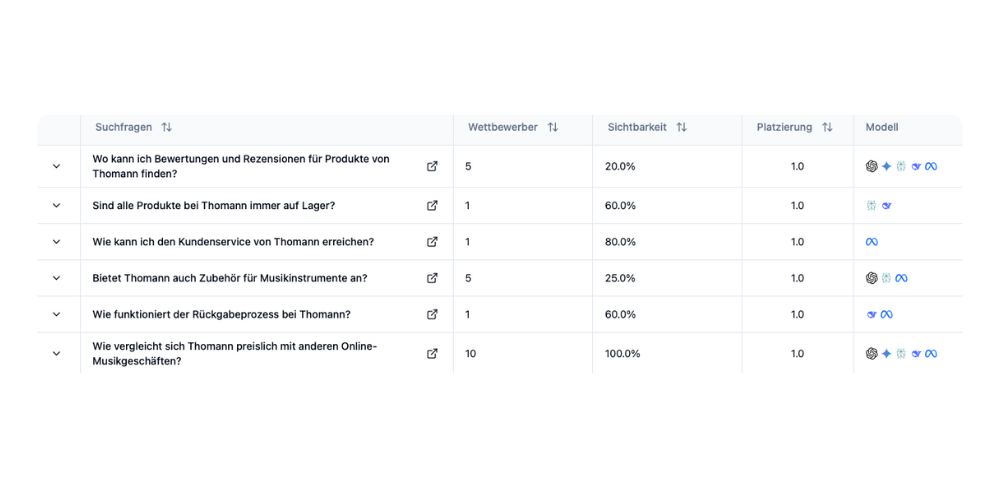 • Das Tool erlaubt modellübergreifende Vergleiche: Du siehst, wie deine Kunden im Vergleich zu Wettbewerbern in verschiedenen LLMs abschneiden.