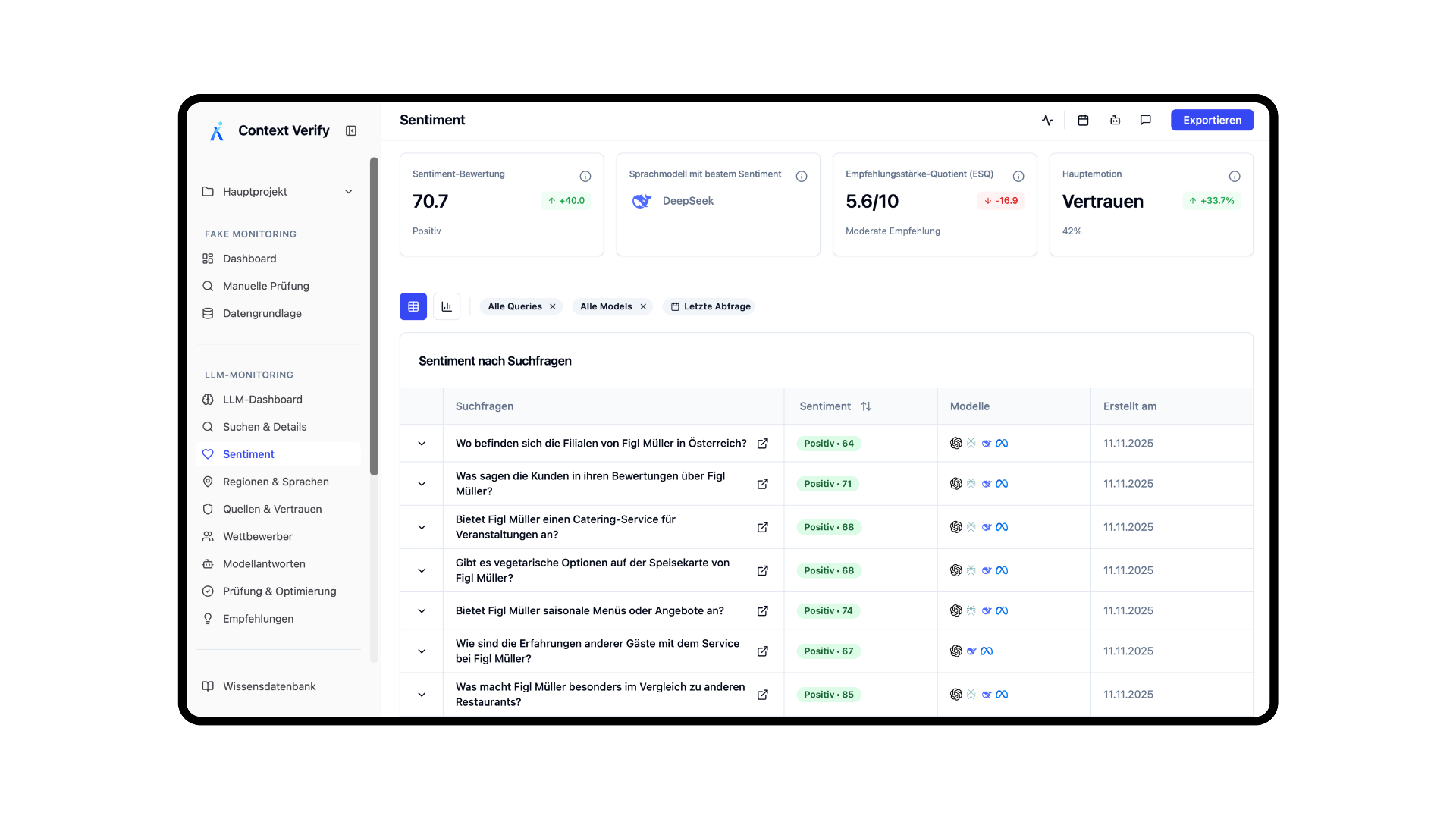 Analysiert, wie positiv, neutral oder negativ über deine Marke gesprochen wird. Mit Filtern nach Suchfrage, Zeitraum und Modell – wichtig für moderne KI im Marketing-Strategien.