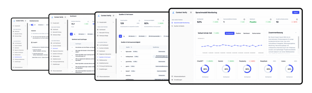 Mit dem Launch unseres LLM-Monitoring erweitern wir das Leistungsspektrum von Context Verify entscheidend: Nicht nur schützen wir Marken im Web, sondern wir machen sie auch sichtbar in der Welt der großen Sprachmodelle. Unser Tool misst und optimiert, wie Ihre Marke in ChatGPT, Gemini, Perplexity & Co. genannt wird – nicht nur hinsichtlich Häufigkeit, sondern auch im Hinblick auf Vertrauenswürdigkeit, Stimmung und Quellen.